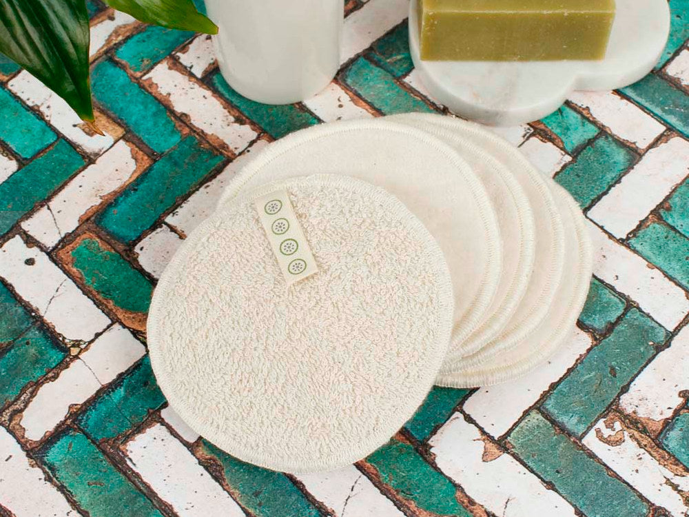 Five large facial rounds with hanging loops. Made from 100% organic cotton, one side is towelling and one is a super soft velvet.